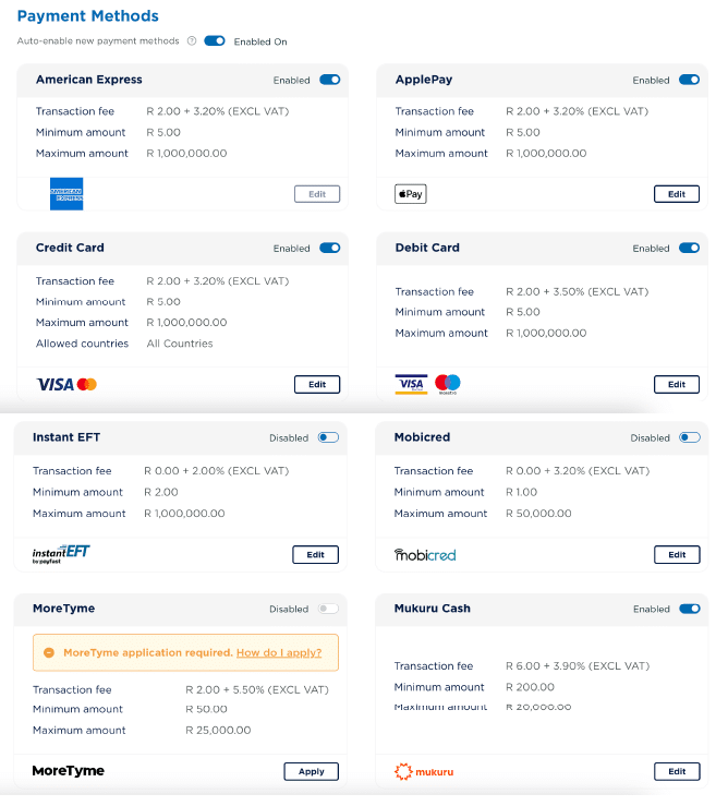 Payout fee: R8.70 (excl. VAT) per payout request.
